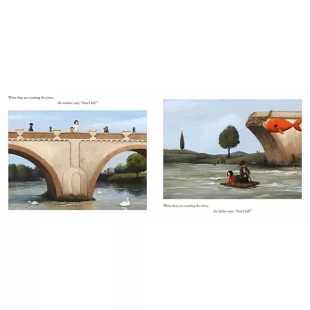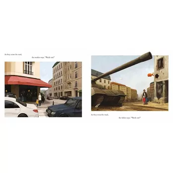 當左頁圖中的媽媽提醒小男孩:「小心!」,他們置身的是日常的馬路路口。同樣一句「小心!」,右頁的爸爸和女兒面對的卻是街上的坦克車,和飽受戰爭摧殘的城市。一句簡短的文字,對照迥異的情境,產生強烈的視覺印象。