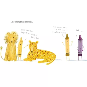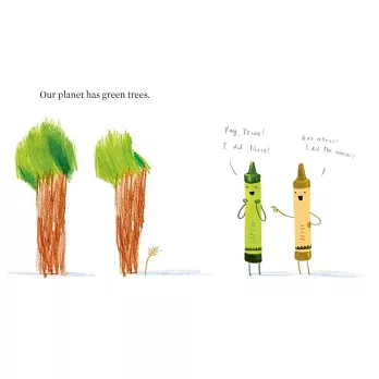 The Crayons Love Our Planet以童趣感十足的筆觸和歡樂的對話,畫出蠟筆視角的地球,展現構成這顆美麗星球的各種色彩。因為有各式各樣的自然景觀和生物,地球是如此美好,蠟筆說:「保護地球是我們的任務!」就讓我們加入蠟筆的行列,一起守護地球吧!