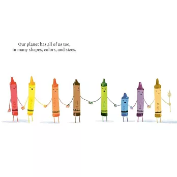 Our planet has all of us...In many shapes, colors, and sizes. The Crayons love our planet and are proud of their contributions. White ice caps, Green trees, Blue oceans and skies, Brown soil...and more! Even Beige is proud of his contribution: Wheat! This humorous book shows the beauty of our planet--and why it needs all of us to be celebrated and complete.
