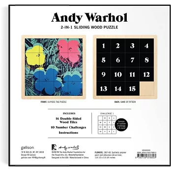* Side 1 is a wood tile puzzle featuring Warhol's iconic Flowers art. Side 2 is a numbers challenge known as "Game of Fifteen"