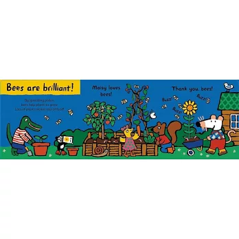 Did you know that bees use their tongues to eat sweet nectar from flowers, then carry dusty pollen on their bodies to spread it from flower to flower? Or that they need lots of flowers, water, and a dry place to live? Through Lucy Cousins’s familiar bold, inviting artwork and cheery narration, the youngest children can join Maisy as she tends to her growing garden and discovers some fun and informative things about the bees that live there. Open the final gatefold to see how Maisy is helping the amazing bees!