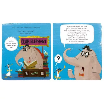 鴨子想要結交新朋友,所以他決定加入獅子俱樂部,但他沒辦法像獅子一樣吼叫,所以被獅子拒絕申請了。接著,他想要加入蛇俱樂部,但他不會像蛇一樣嘶鳴,所以他的申請也被拒絕了。後來,他鼓起勇氣要加入大象俱樂部,可是要像大象那樣聰明才能加入,鴨子一樣做不到……那麼,鴨子到底該怎麼辦呢?