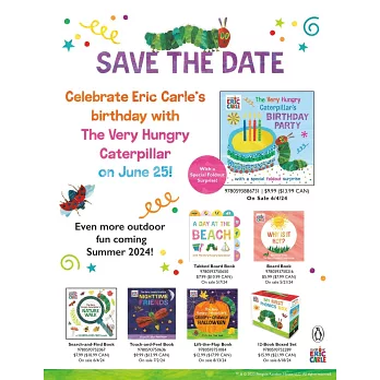 Eric Carle is acclaimed and beloved as the creator of brilliantly illustrated and innovatively designed picture books for very young children. His best-known work, The Very Hungry Caterpillar, has been translated into 70 languages and sold over 55 million copies. Carle illustrated more than seventy books, many best sellers, most of which he also wrote, and more than 170 million copies of his books have sold around the world. In 2003, Carle received the Laura Ingalls Wilder Award (now called the Children’s Literature Legacy Award) for lifetime achievement in children’s literature. In 2002, Eric and his wife, Barbara, cofounded The Eric Carle Museum of Picture Book Art (www.carlemuseum.org) in Amherst, Massachusetts, a 40,000-square-foot space dedicated to the celebration of picture books and picture book illustrations from around the world, underscoring the cultural, historical, and artistic significance of picture books and their art form. Eric Carle passed away in May 2021 at the age of 91. His work remains an important influence on artists and illustrators at work today. www.eric-carle.com