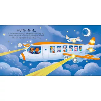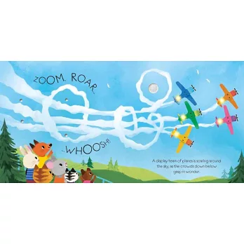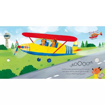 From an old-fashioned biplane taking off to a helicopter flying over a canyon, there are all kinds of exciting flying machines to discover in this novelty book... and when you press the button on each page you can hear each one and switch on its lights. The charmingly illustrated animal pilots are shown landing a sea plane on the water, guiding a jet airliner through the clouds and wowing the crowds with a spectacular acrobatic display at the end.