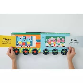 •Flip the book to play the fun counting game on the reverse. Then push the train-shaped book along on its six moving wheels!