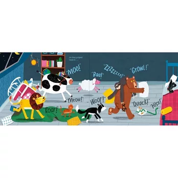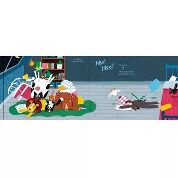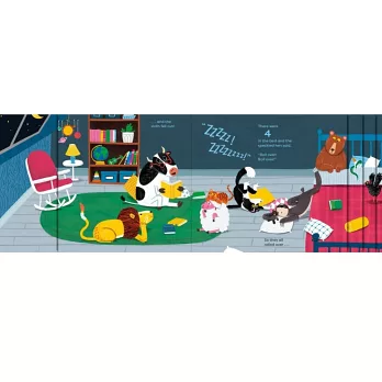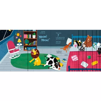 小動物們吵吵鬧鬧地挪動位置,卻一個接一個從床上滾下來,九隻、八隻、七隻⋯⋯床上越來越空,但整個房間卻越來越亂,大家還能睡得著嗎?