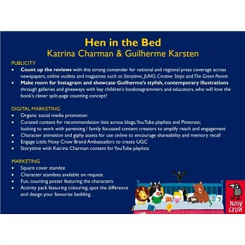 以《The Whales on the Bus》獲得英國Booktrust時間故事獎(Story Time prize)的作者Katrina Charman,再次以知名童謠為創作靈感,推出《Hen in the Bed》這首知名童謠的母雞版本。跟著母雞一起數數,把動物們一個一個推下床,逗趣的故事、獨特的分頁設計,瘋狂、喧鬧的故事讓書頁翻起來充滿樂趣,小朋友可以邊快樂閱讀,邊學習數數,還能學會簡單的英文單字!