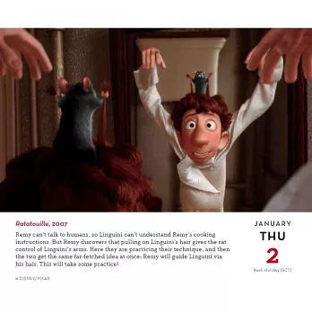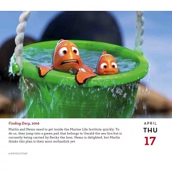 This stunning, full-color, day-to-day calendar celebrates an entire year of Disney’s and Pixar’s magical films and shorts!