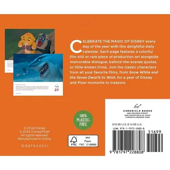 From Snow White and the Seven Dwarfs to Wish, this charming desk calendar features a colorful image each day from one of the iconic feature films or shorts from Disney and Pixar. Each image is accompanied by insider information, trivia, plot notes, or memorable quotes from the animated film. This tear-off calendar offers daily inspiration and beautiful imagery in a delightful Disney package. (c) 2024 Disney/Pixar. All rights reserved. CELEBRATE THE ENDURING MAGIC OF DISNEY: This calendar is perfect for Disney and Pixar fans of all ages. It taps into the nostalgic affection that adult fans have for the characters and films of their youth and welcomes new generations of young fans with beautiful visuals and compelling facts and quotes. BEHIND-THE-SCENES VISUALS: In addition to fan-favorite final frames, this calendar includes behind-the-scenes visual development and production art from the most iconic films and shorts through 2023. DAILY INSPIRATION: Every day of the year (with weekends combined) features a new, beautiful full-color piece of art, offering daily fun and everyday magic. 100% PLASTIC-FREE CALENDAR: Featuring a sturdy cardboard desk stand instead of a plastic stand, this calendar is now free of all plastic. It has no single-use plastic shrink wrap and is 100% recyclable.Chuck Wilson writes about film for LA Weekly. Born in Florida, he currently lives just over the hill from Walt Disney Animation Studios.