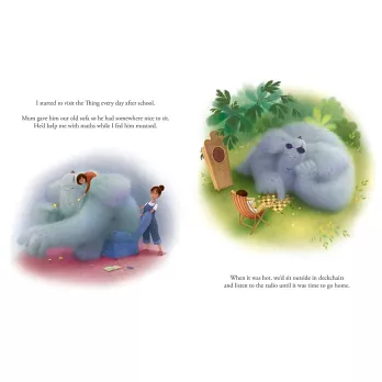 有個神祕生物住在小女孩家的街上,他住在52號,在去學校的路上小女孩看見他坐在花園裡。他看起來又大又笨重,大大的頭上戴著一頂小小的帽子,小女孩覺得他應該沒有朋友,所以帶了一朵花給他。沒多久,小女孩和他就變成好朋友,這個神祕生物溫柔又善良,他們一起去冒險,這是小女孩覺得最美好的記憶。小女孩很快發現神祕生物有很多同類住在不同地方,小女孩想到,可以邀請大家一起來舉辦派對!大家跳舞到半夜,感受到從未有過的快樂。只是,有相聚就有別離,冒險結束,到了必須說再見的時候⋯⋯