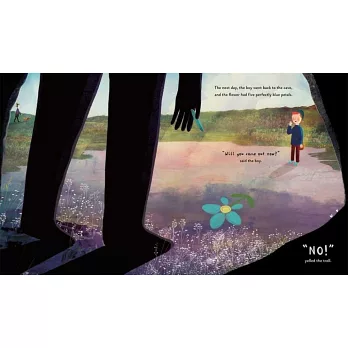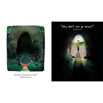 Only one child cannot turn their back on the troll at the edge of the playground. One day, he takes his chalks up to the mouth of the cave. He draws a flower with every petal coloured in but one, and leaves the chalk behind. The next day, the flower has been completed. Day-by-day, the boy and the troll finish each other's drawings, until they each draw a portrait, showing a boy holding hands with a fierce, scary troll. "But you're not a troll," says the boy. "You're a boy - just like me."