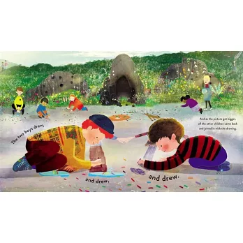 Patience, kindness and the power of art win out in the end: the two boys wordlessly draw together. Soon all the other children gather to join in with the game. Everyone forgets that there was a troll inside the cave. Because outside the cave, there is so much to draw.