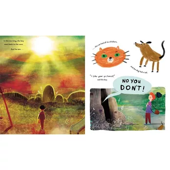 大家都說洞穴裡住了一個巨大、暴躁的怪物,「走開!」他的怒氣,讓每個人都躲得遠遠的。一個男孩卻不怕,用粉筆在洞口畫了一朵漂亮的花,留下一個花瓣沒上色,默默地把畫畫用的粉筆,留在花朵旁。第二天,所有的花瓣都塗上了漂亮的粉彩!於是,男孩每天跑到洞口,和洞裡的怪物接力完成一幅又一幅塗鴉。直到他們畫出了一個男孩,和一個兇巴巴的大怪物,手牽著手。男孩宣告:「你才不是怪物哩!我知道你是個男孩,就像我一樣。」男孩的耐心和善良,軟化了塵封已久的心,洞裡的他終於願意走到外頭來,和男孩一起畫畫。附近的小孩全都好奇地慢慢聚集了過來,大夥兒盡情地在地上塗鴉,全都忘了洞穴曾經很可怕。