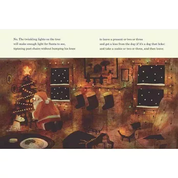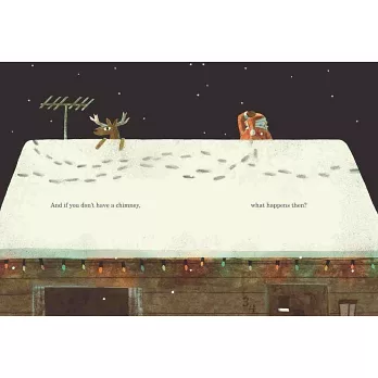 或是你家根本沒煙囪!會不會他是把自己折成扁扁一封信,讓麋鹿從信箱投遞進來呢?如果家裡有狗狗,又要怎麼讓他們不叫?