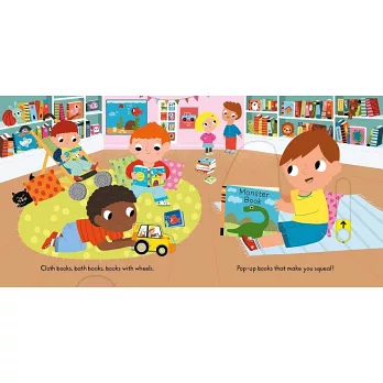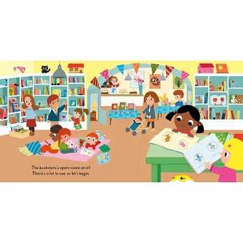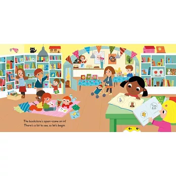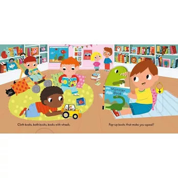 Push, pull and slide the scenes to bring the Busy Bookshop to life! Change the pictures in a book, pull make a dinosaur pop up and help the author turn the pages as he reads.
