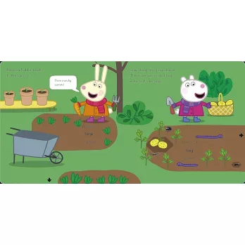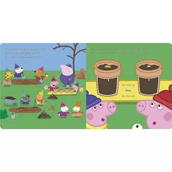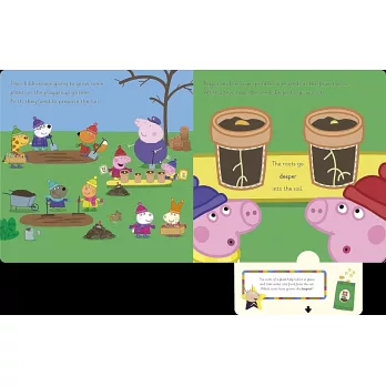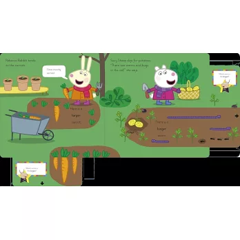 'Grow plants and expand your vocabulary with Peppa and her friends! Learn about growing flowers and vegetables and practise describing what you see in this fun, interactive board book. Encourage children to pull the tabs to see the plants grow and change the words on the page. Practise using common adjectives such as "bigger", "longer" and "taller".
