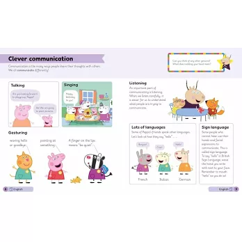 帶孩子跟著最喜歡的粉紅豬小妹,探索有趣知識!從語言到數學,從大自然的奧秘,到複雜又有趣的身體,或是內心情緒等各種主題,都能跟著粉紅豬小妹學習有趣的小知識。例如:你知道溝通除了透過言語,還能用唱歌的方式來表達內心的想法嗎?甚至是揮手、做動作,也能讓對方暸解你的心意。粉紅豬小妹第一本小百科充滿了引人入勝的科學事實與清楚易懂的解釋,讓小朋友在粉紅豬小妹卡通主角帶領下,探索大千世界。