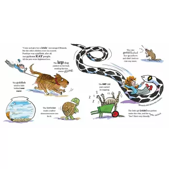今天是「學校寵物日」,老師說可以把自己的寵物帶來學校。校園瞬間變得好熱鬧,有沙鼠、金魚、肥貓、烏龜還有長得很高大的狗……但是米蘭達帶來的,是一隻巨蟒,名字叫小潘潘!