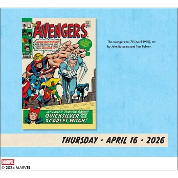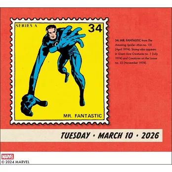 Featuring over 300 images of Super Heroes and Super Villains from the acclaimed Marvel Value Stamps, this 2026 daily desk calendar includes reproductions of the original 1974 and 1975 stamp series, alongside later reissues of the stamps and other related ephemera. Also included is a brief history about the Marvel Value Stamps by former Marvel editor-in-chief Roy Thomas. Features include:About Marvel