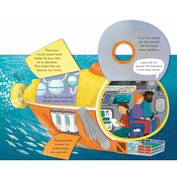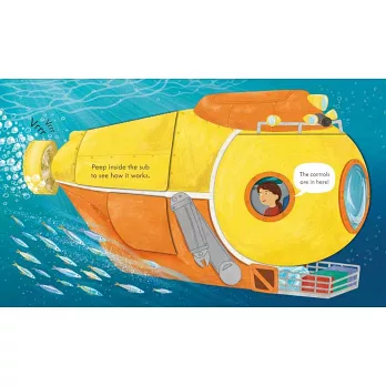 Lift flaps and peep through holes to explore with a little sub on a deep-sea dive. Find out how the sub works by opening it up and peeping inside at the cockpit and the ballast tanks, and help the crew collect deep-sea samples using the mechanical arms. There’s lots to learn about marine life, too - investigate what an octopus is guarding, meet a hammerhead shark and switch off the sub lights to see all the glowing creatures in the dark.