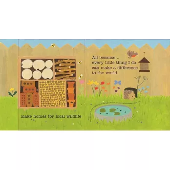 從選擇非塑膠的環保材質牙刷,到二手舊衣改造再利用,提供貼近日常生活、容易執行的綠色提案,讓孩子可以將環保落實生活。有趣的挖洞和翻頁機關設計,增添閱讀的互動趣味性,鼓勵孩子從隨手做得到到小小行動開始,一起為世界帶來有意義的重要改變。