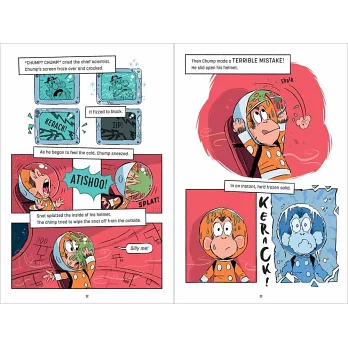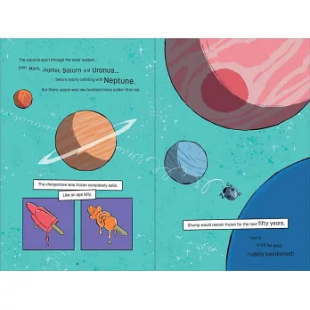 史上第一隻被送上太空的黑猩猩,鐵定是萬中選一、全世界最聰明的天選之猩吧,讓我們介紹黑猩猩強普出場!等等,翻開英文字典,強普(Chump)不是「小傻蛋」的意思嗎?讓我們觀察一下,強普總是吃下香蕉皮,果斷地把香甜美味的部分通通丟掉用,任意發出各種粗魯無禮的聲響,還常常使用小腳指來挖鼻孔!是的,傻里傻氣的強普,就是美國國家太空總署的科學家們公認最適合出使本次危險任務的天選之猩。一連串爆笑荒謬的太空冒險,就此展開!