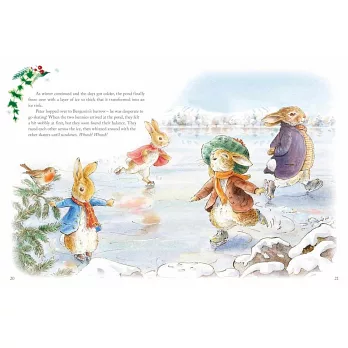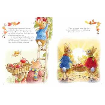 在這本美麗的繪本裡,彼得兔在林地裡度過精彩的一年。獨特細膩的寫實風格,結合英國鄉村感,花園、田野、森林呈現出優美、寧靜的自然風光。筆觸細膩的風格,充滿童趣的想像,故事中還會出現許多大家熟悉的角色,包括小兔班傑明、小松鼠胡來、三隻可愛的小兔小福、小毛和小白⋯⋯。