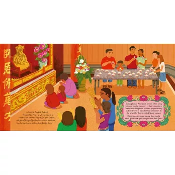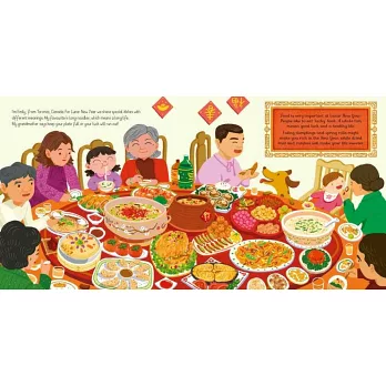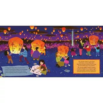 農曆春年是個非常重要的傳統節慶,不只在台灣,從中國、越南、新加坡、泰國、印尼,到地球另一端的舊金山、倫敦、雪梨,許多國家都有人在慶祝農曆新年。故事以每個城市的孩子為主角,從中國小女孩跟著家人採買年節食物、春聯布置,到在多倫多一家人的除夕團圓大餐、新加坡小男孩開心領紅包、泰國的祭拜祖先、雪梨以煙火取代鞭炮趕走年獸,再到台灣元宵節冉冉升空的天燈……各地同慶這個熱鬧的節日,讓我們一起來體驗不同國家各具特色的過節氛圍。