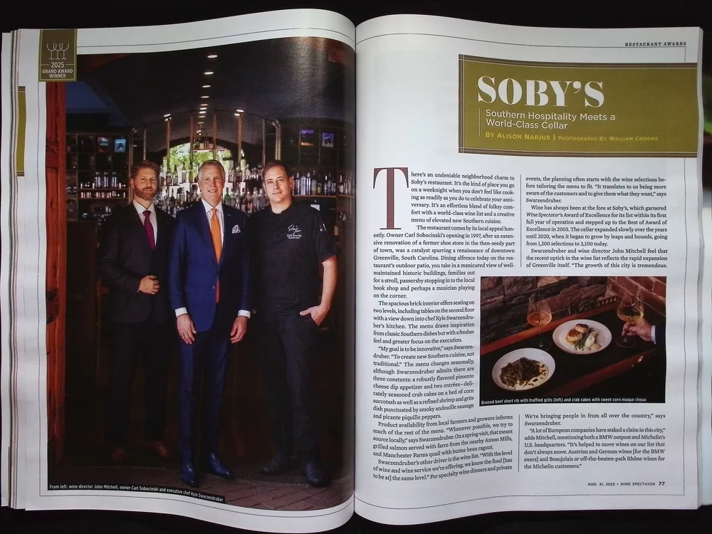 《Wine Spectator》2025年8月31日號公布年度餐廳大獎,精選3,011間擁有頂級酒單的美食名店,封面為獲得最高榮譽的加州Healdsburg餐廳SingleThread之菜餚。內容深入介紹餐廳團隊與酒窖特色,並特別紀念美國餐飲界傳奇人物Charlie Trotter,回顧其對高端餐飲的深遠影響。