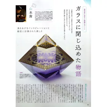 在切割成幾何學的玻璃中有金色與銀色的圖案,這是山本茜使用傳統的「截金」技巧創作的玻璃作品,從山本茜到松村淳,在這特別要介紹作家們所創作的玻璃藝術。