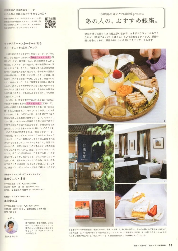 「松屋銀座」與西餐廳「三笠會館」也在今年迎接成立100週年,銀座到日本橋地區可是東京知名的購物天堂,而除了購物之外,其實集結豐富多元料理的銀座到日本橋地區也是美食天堂,以在今年迎接130週年的煉瓦亭為首,本期特別要介紹銀座到日本橋的人氣美食,另外,還要請到寫過許多有關甜點與伴手禮書籍的作家甲斐MINORI來精心挑選出銀座到日本橋地區的12個人氣甜點與伴手禮。