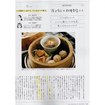 不只是開料理教室還推出許多料理書的日本知名料理家,由渡邊有子擔任老師來教大家如何做料理的本誌連載「渡邊有子的料理筆記」,這一次特別要教大家用蒸籠來做出3道料理。