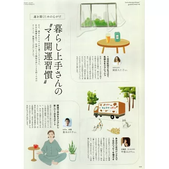 運氣好的人在日常中有什麼樣的習慣?從起床後就會喝溫水和冥想的模特兒菜木Noriko、睡覺前會清掃廚房與廁所用水處的料理研究家藤井惠…等,在這特別要請到各領域名人來介紹他們的開運小習慣。