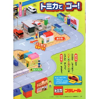 以家為起點,多美小汽車出發囉。前進路線已經規劃好了,請依照1加油站、2甜甜圈店、3郵局、4幼稚園的順序移動,最後回家就算抵達終點,一起來玩吧。