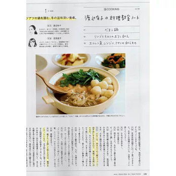不只是開料理教室還推出許多料理書的日本知名料理家,由渡邊有子擔任老師來教大家如何做料理的本誌連載「渡邊有子的料理筆記」,這一次特別要教大家做適合寒冷冬天的美味火鍋。