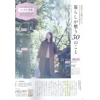 認真看待每天的生活,保持自己的好心情,衣服以穿起來舒適為要點,生活中身邊圍繞的都是喜歡的東西。內在的價值觀,也隨著時間一點一點地做調整,不再如以往般,拼命追逐並非真正必要的物欲,改走簡約和經久不退的造型取向。從時尚、料理、旅遊、到居家生活,轉變為月刊的『自然生活風格服飾圖鑑』,將繼續以全方位的角度,來企劃製作讓大家生活更自在的新提案。