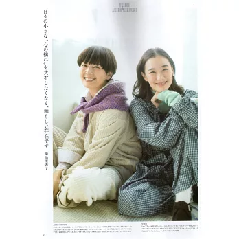 同樣是時尚指標人物,私交甚篤的菊池亞希子蒼井優從去年夏天開始在podcast共同主持節目「アオイとキクチ」,獲得不少好評。在封面對談中兩人回答了讀者提問,分享她們的生活哲學。