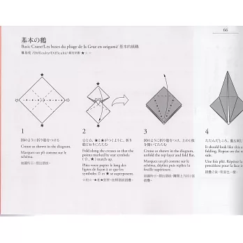 從基本紙鶴開始,以圖解搭配英、法、中三種語文對照,輕鬆學習摺紙技巧。