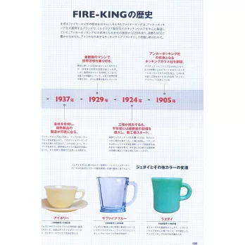 1941年誕生的FIRE KING以翡翠般的美麗色澤和堅固耐用的厚實質感深得人心,在當時是美國家家戶戶都有的人氣餐具,雖然已經在1986年停產,但這些漂亮杯子可沒有被遺忘,而是成為古董收藏玩家的最愛之一。「FIRE KING馬克杯完全解析讀本」就從FIRE KING的歷史談起,全面介紹FIRE KING的魅力創作。先特寫大家都認識的定番款,再帶來各式各樣的設計馬克杯,其中還有難得一見的珍品、未曾在市面上流通的試作品…等等,超過1500款的豐富內容,絕對值得好好研究。