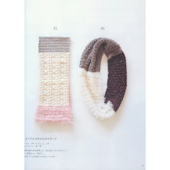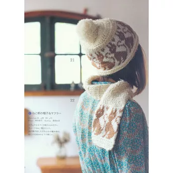咖啡色與米色交換排列出坐姿貓咪圖樣,運用在成套的圍巾與帽子上,單色處改用特殊線模擬貓咪皮毛的觸感。
