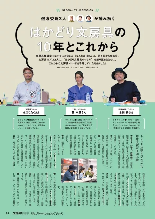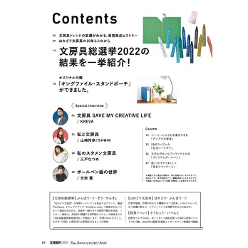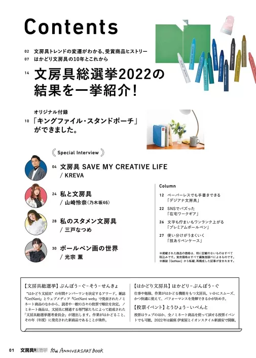 2013年作為雜誌「GetNavi」第一企劃開始的「文具用品總選舉」,本次將透過回顧這10年間獲獎特寫文具商品的同時,邀請到評選委員會成員菅未里女士、きだてたく女士和古川耕先生,一同來重溫並帶領大家了解文具變化趨勢的歷史,內容也將特別採訪愛文具的人們!包括藝術家KREVA、乃木坂46的山崎怜奈、模特兒兼女演員的三戶夏芽和光宗薫等人,來談談大家最喜歡的文具。