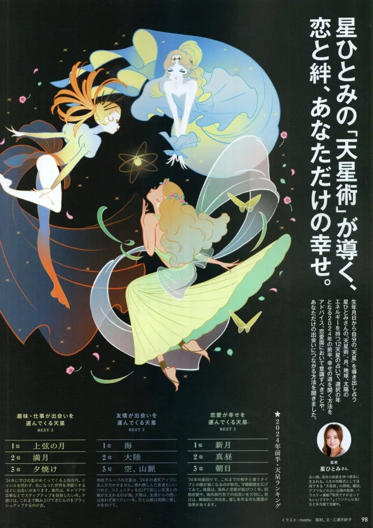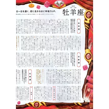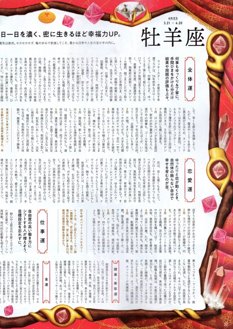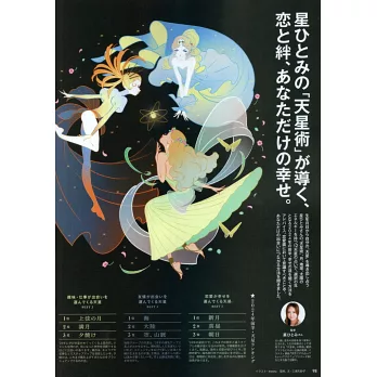 有許多不滿與不安的2023年即將結束,在邁入2024年時,掌管幸運的木星恢復順行,這段時間的不順心也會慢慢往好的方向發展,隨著新的一年即將到來,本期首先要請到占卜界傳奇G・ダビデ研究所來為大家預測2024年上半年的戀愛運與運勢,並且要請到知名占卜師岩波れいみん來為大家預測2024年的財運與工作運。而已經宣布要改名的Sexy Zone,本期特別要請到成員們來和大家分享現在的心情以及回顧過去這一年的點點滴滴,另外,1990年開始連載的傳奇漫畫「幽遊白書」終於翻拍成真人版影集,本期特別要請到演出本作的北村匠海、志尊淳、本鄉奏多以及上杉柊平來聊聊演出本作的感想。(本誌與「an・an 12月20日/2023─封面:Sexy Zone」內容相同僅封面人物不同)