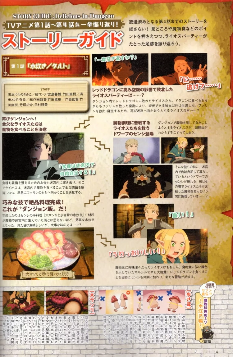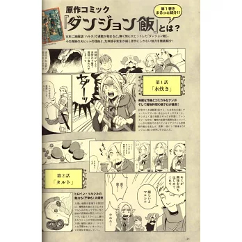 然而緣份並沒有就此結束。已經於2024年1月開播中的電視動畫版,預計將以連續播出二季的24話,帶大家更容易沈浸在《迷宮飯》的世界。特別針對電視動畫開播紀念所製作的這一冊專集,內容包含了主要角色介紹、第1~4話故事回顧、原作魅力&全14冊封面、聲優&工作團隊專訪、設定畫&分鏡圖、嚴選日本真實世界28處冒險景點攻略導覽(分為「洞窟篇」「吊橋篇」「遺構篇」「大自然篇」)、珍稀美食大調查、作品登場料理的重現食譜集等。不僅回顧介紹作品的世界,還送上真實體驗的提案。