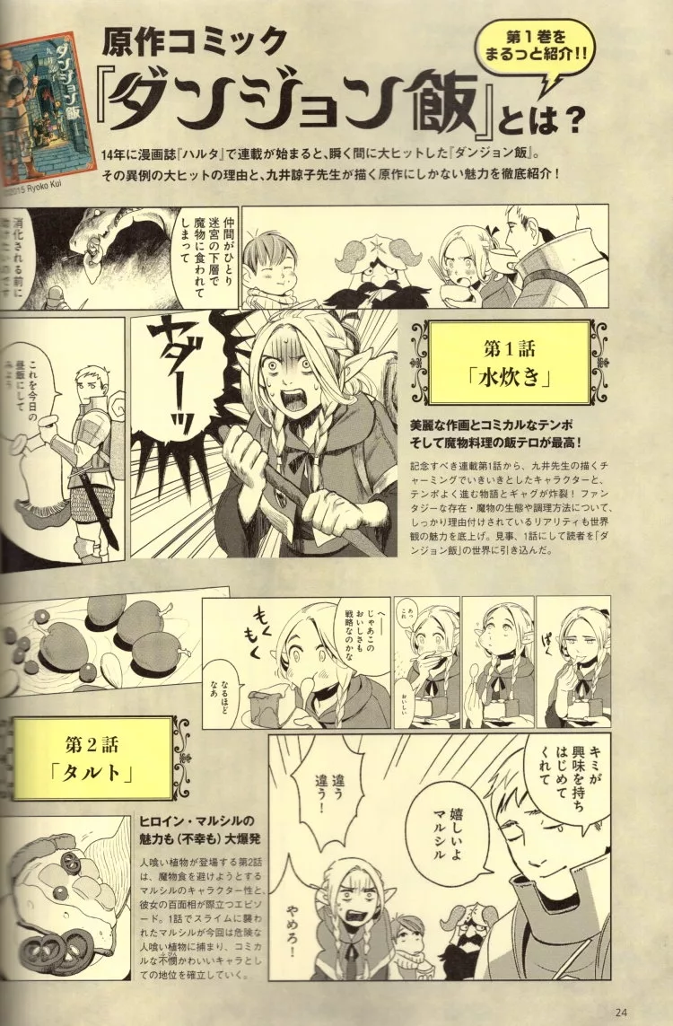 不管是史萊姆、巴西利斯克、寶箱怪、食人植物、還是龍,出現在這部作品裡的各種奇幻生物,統統都會成為冒險者們勇闖驗迷宮途中的盤中美味。故事設定如此獨特有趣的《迷宮飯》,毋怪乎從漫畫連載之初人氣便瞬間飆高,2016年還獲得「這本漫畫真厲害!」男生篇第一名的肯定。歷經九年半的漫畫連載,終於在2023年迎來了完結篇。