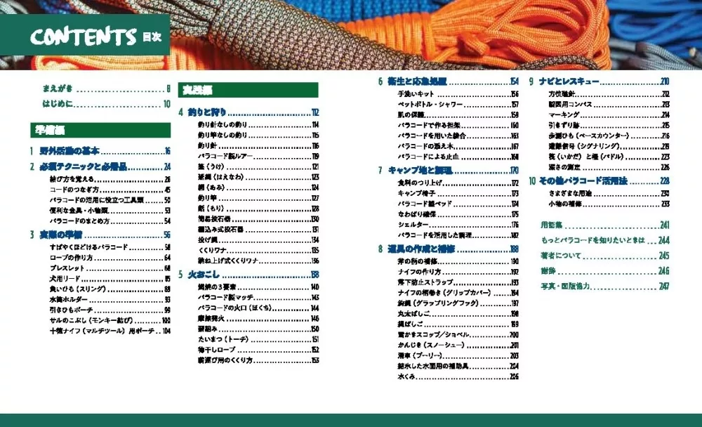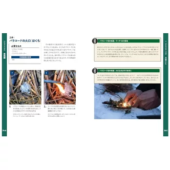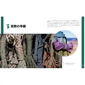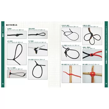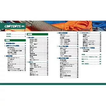 戶外活動和露營時如果懂得傘繩綑綁技巧,不僅能大幅提升作業效率,它同時也是關鍵時刻求生保命的生存技巧。最新傘繩綑綁與使用技巧完全手冊,在前半部「準備篇」首先介紹傘繩綑綁的基本特徵、種類、打結方式,並提案繩編製作的手鍊、保溫瓶套之類的手藝作品;到了後半部「實踐篇」正式切入正題,一連傳授釣魚、生火、貯水、料理等,看似傘繩綑綁不可能做到的使用技巧。傘繩綑綁不只是加深戶外活動的便利性,更是值得信賴的技能。
