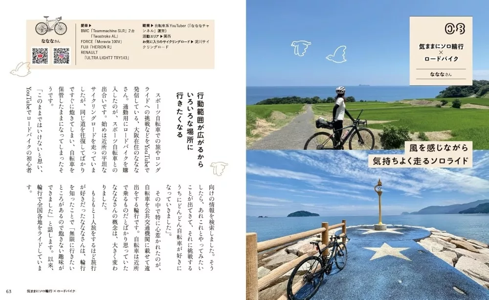 満員電車を避けてクロスバイクで通勤、健康のため週末はロードバイクで遠出、輪行して旅先で絶景ツアーや聖地巡礼、マウンテンバイクを車に積んで登山&キャンプ、ミニベロで街中散策…。自転車のある暮らしの楽しみ方は、人ぞれぞれ。この本では、PART1で、サイクリスト12人に楽しく乗るための工夫や習慣を伺いました。せっかく買ったのに放置しているという人も必見です。