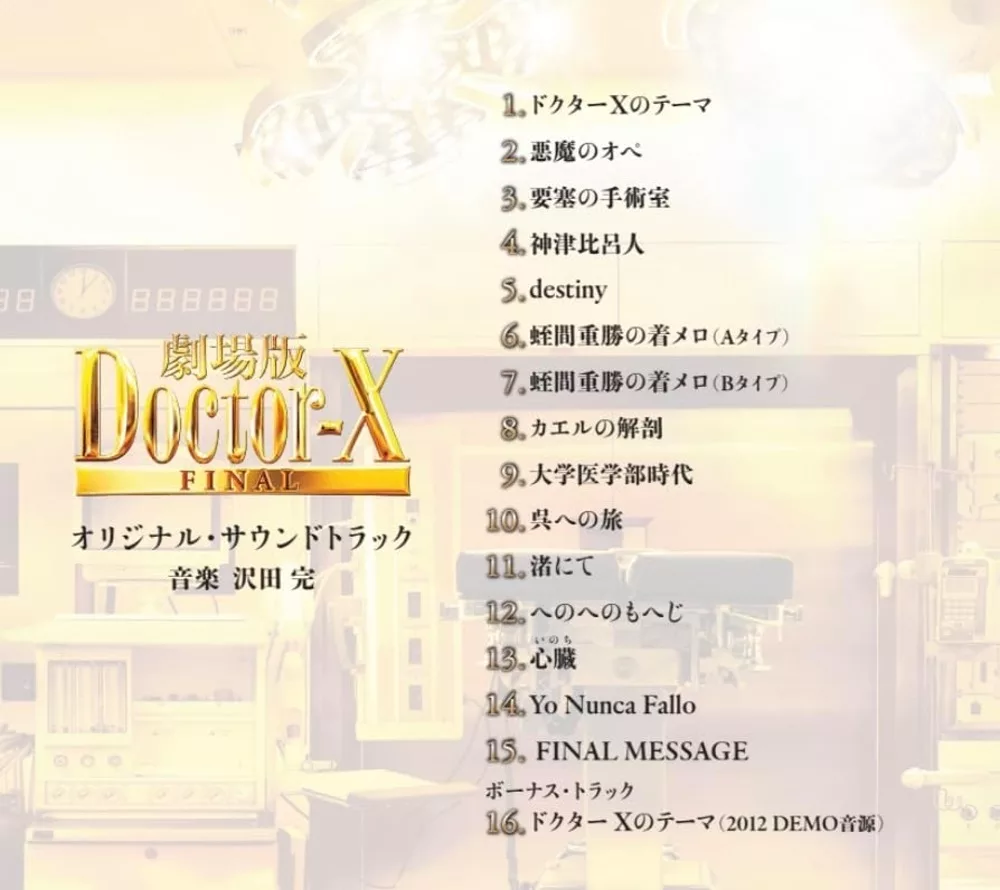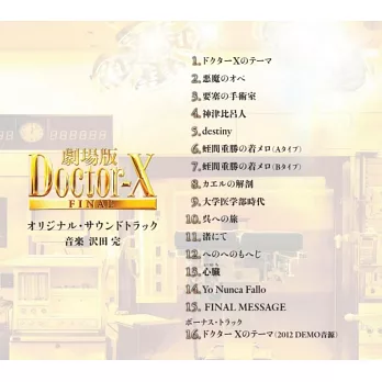 由知名女星米倉涼子所主演的醫療電視劇「DOCTOR X外科醫生大門未知子」,從開播後就成為話題與受到喜愛,這部由2012年由朝日電視台至今一共播出了七季!本次為系列完結篇電影版,在「派遣女醫X Final」OST的專輯中,將收錄作曲創作家澤田完在劇集開始時期製作的「DOCTOR X派遣女醫」中珍貴的音源,並以此作為特別收錄曲目!(其他還收錄了完成版、電視系列DOCTOR X派遣女醫主題曲),此外內容也將收錄導演田村直己和作曲家澤田完的對談專訪刊載!粉絲讀者們推薦珍藏擁有!