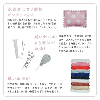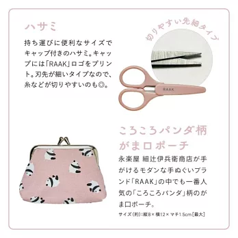 以充滿春天氛圍的粉紅色為中心,再加上滾來滾去的可愛熊貓圖案,本誌除了要附上永樂屋 細辻伊兵衛商店人氣熊貓圖案的口金包之外,還要附上包含針、線、針插、剪刀…等裁縫用具的針線組。(口金包的尺寸約為長8×寬12×高1.5㎝)