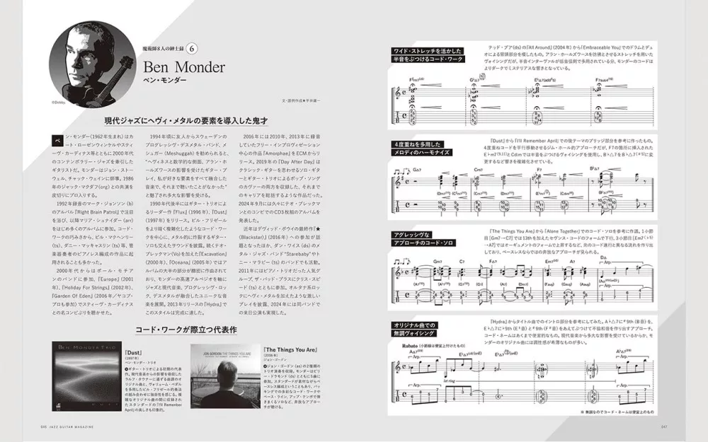 ジャズ・ギターの醍醐味としてアドリブやリズムと並んで挙げられるのが、ほかのジャンルにも大きな影響を与える複雑なハーモニー感である。今号ではジャズ・ギターのハーモニーの弾き方、楽しみ方を伝える。ジム・ホール、ビル・フリゼール、ベン・モンダーなど、革新的なジャズ・ハーモニーを生み出してきたギタリストを多角的に分析し、一歩進んだハーモニーを身につけるためのノウハウが満載。カート・ローゼンウィンケル、ウォルフガング・ムースピールらによる本誌のための解説も充実。