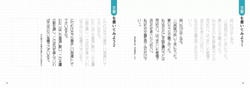 前半ではひらがな・カタカナ・漢字の練習をし、後半では「もこ字の鉄則」を活かして詩や小説の一節などを書いてみましょう。本書では、夏目漱石の『夢十夜』や小川未明の『月とあざらし』、室生犀星や萩原朔太郎の詩、北大路魯山人の書論からの引用などを「もこ字」で手書きします。アルファベットの練習を兼ねて、英語の名文をなぞる章もあります。
